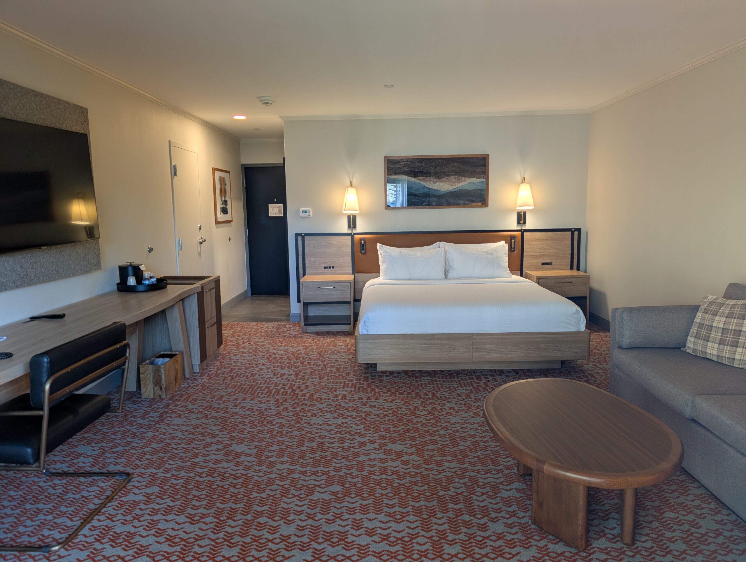 We’ve actually loved the rooms we’ve stayed in. Each time we stroll into the resort, we each say how a lot we like the fashionable lodge look. There’s a complete wall of books to browse, an enormous fire, and a big desk for enterprise work. You’ll additionally see a couple of good and comfortable seating areas the place you possibly can work, discuss, or have a cup of espresso.